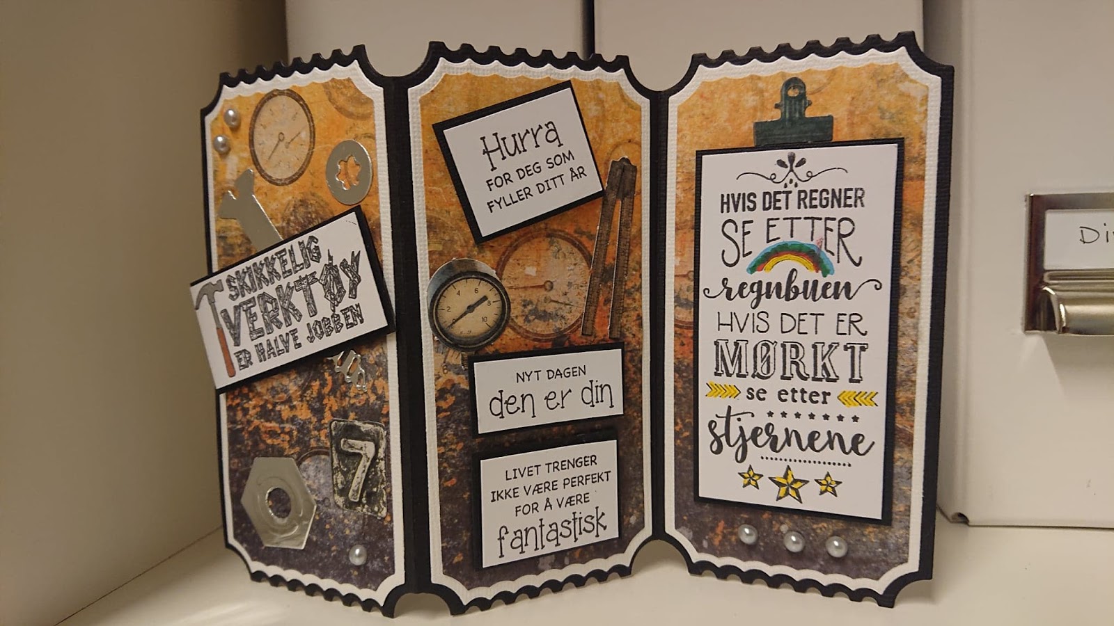Tekstene er stemplet direkte på kortet, og en liten blomst med en "diamant" ble limt på.